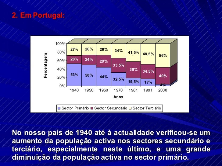 12. 12. 2. Em Portugal: No nosso país de 1940 até à actualidade verificou-se um aumento da população activa nos sectores secundário e terciário, especialmente neste último, e uma grande diminuição da população activa no sector primário.