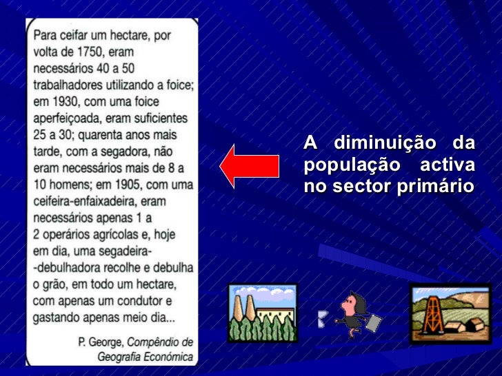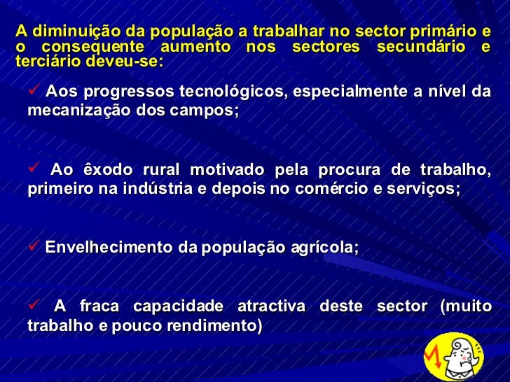 13. 13. <ul><li>A diminuição da população a trabalhar no sector primário e o consequente aumento nos sectores secundário e terciário deveu-se: </li></ul><ul><li>Aos progressos tecnológicos, especialmente a nível da mecanização dos campos; </li></ul><ul><li>Ao êxodo rural motivado pela procura de trabalho, primeiro na indústria e depois no comércio e serviços; </li></ul><ul><li>Envelhecimento da população agrícola; </li></ul><ul><li>A fraca capacidade atractiva deste sector (muito trabalho e pouco rendimento) </li></ul>
