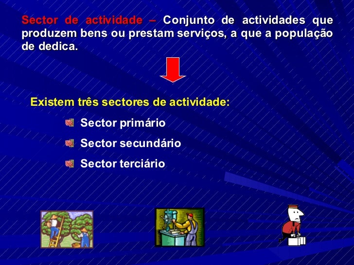 2. 2. Sector de actividade – Conjunto de actividades que produzem bens ou prestam serviços, a que a população de dedica. <ul><li>Existem três sectores de actividade: </li></ul><ul><ul><ul><li>Sector primário </li></ul></ul></ul><ul><ul><ul><li>Sector secundário </li></ul></ul></ul><ul><ul><ul><li>Sector terciário </li></ul></ul></ul>