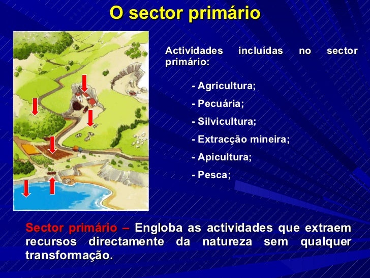 3. 3. O sector primário Sector primário – Engloba as actividades que extraem recursos directamente da natureza sem qualquer transformação. Actividades incluídas no sector primário: - Agricultura; - Pecuária; - Silvicultura; - Extracção mineira; - Apicultura; - Pesca;