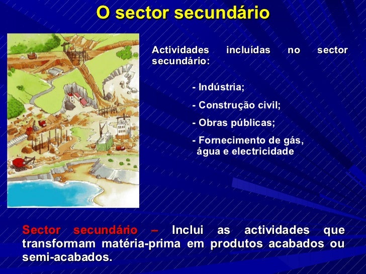 4. 4. O sector secundário Sector secundário – Inclui as actividades que transformam matéria-prima em produtos acabados ou semi-acabados. Actividades incluídas no sector secundário: - Indústria; - Construção civil; - Obras públicas; - Fornecimento de gás, água e electricidade