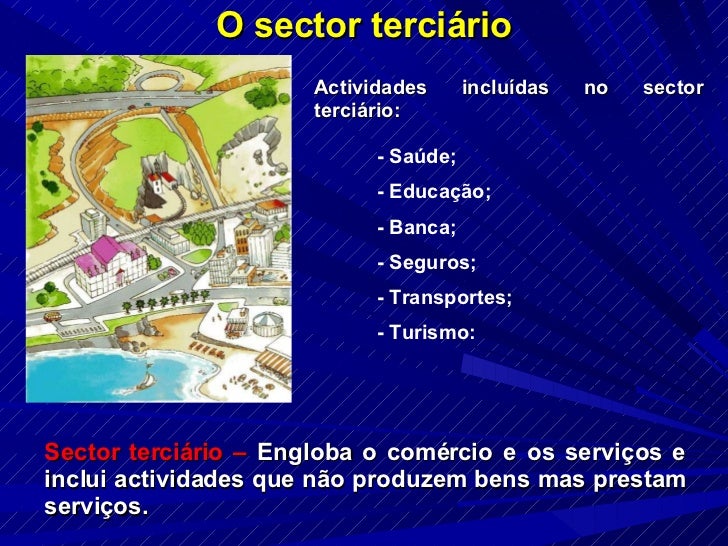 5. 5. O sector terciário Sector terciário – Engloba o comércio e os serviços e inclui actividades que não produzem bens mas prestam serviços. Actividades incluídas no sector terciário: - Saúde; - Educação; - Banca; - Seguros; - Transportes; - Turismo: