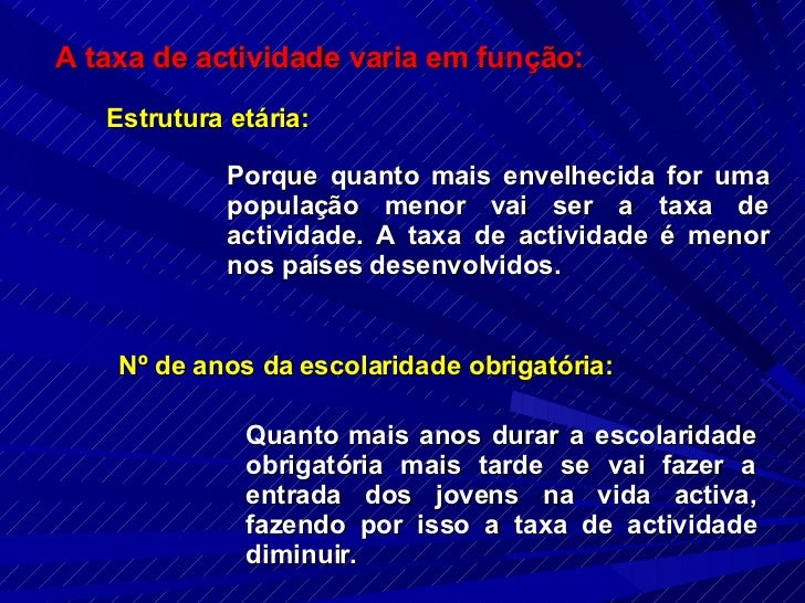 7. 7. A taxa de actividade varia em função: Estrutura etária: Porque quanto mais envelhecida for uma população menor vai ser a taxa de actividade. A taxa de actividade é menor nos países desenvolvidos. Nº de anos da escolaridade obrigatória: Quanto mais anos durar a escolaridade obrigatória mais tarde se vai fazer a entrada dos jovens na vida activa, fazendo por isso a taxa de actividade diminuir.