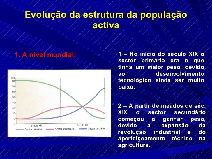 8. 8. Evolução da estrutura da população activa 1. A nível mundial: 1 – No início do século XIX o sector primário era o que tinha um maior peso, devido ao desenvolvimento tecnológico ainda ser muito baixo. 2 – A partir de meados de séc. XIX o sector secundário começou a ganhar peso, devido à expansão da revolução industrial e do aperfeiçoamento técnico na agricultura.