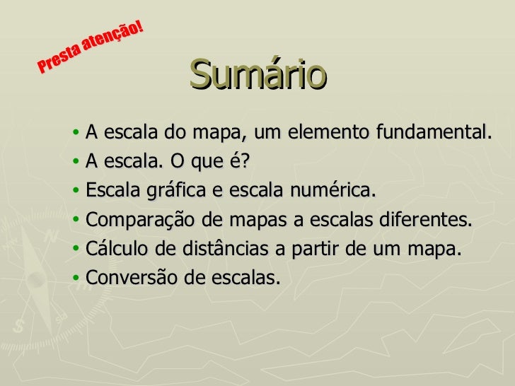 3. 3. Sumário <ul><li>A escala do mapa, um elemento fundamental. </li></ul><ul><li>A escala. O que é? </li></ul><ul><li>Escala gráfica e escala numérica. </li></ul><ul><li>Comparação de mapas a escalas diferentes. </li></ul><ul><li>Cálculo de distâncias a partir de um mapa. </li></ul><ul><li>Conversão de escalas. </li></ul>Presta atenção!