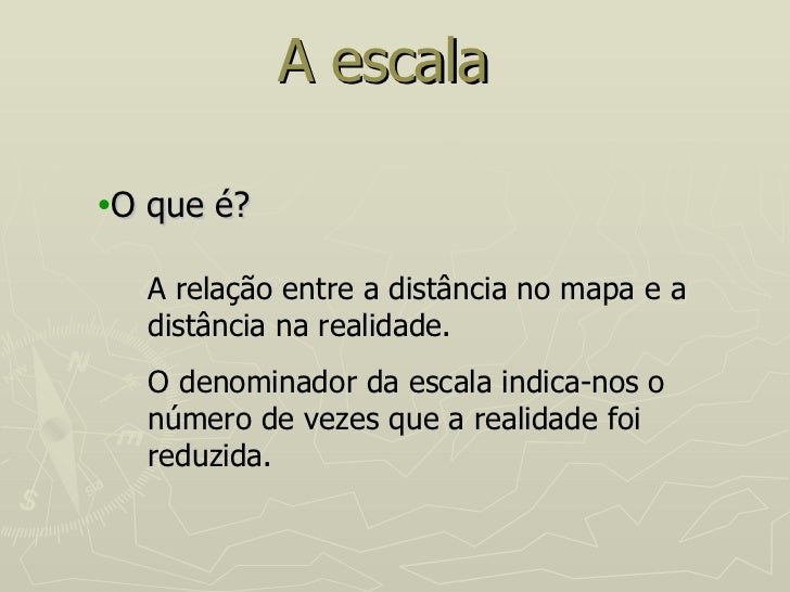 4. 4. A escala <ul><li>O que é? </li></ul>A relação entre a distância no mapa e a distância na realidade. O denominador da escala indica-nos o número de vezes que a realidade foi reduzida.