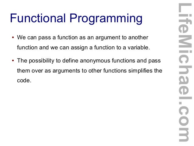 10. 10. ● We can pass a function as an argument to another function and we can assign a function to a variable. ● The possibility to define anonymous functions and pass them over as arguments to other functions simplifies the code. LifeMichael.com Functional Programming