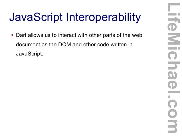 12. 12. ● Dart allows us to interact with other parts of the web document as the DOM and other code written in JavaScript. LifeMichael.com JavaScript Interoperability