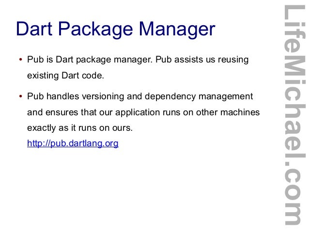 14. 14. ● Pub is Dart package manager. Pub assists us reusing existing Dart code. ● Pub handles versioning and dependency management and ensures that our application runs on other machines exactly as it runs on ours. http://pub.dartlang.org LifeMichael.com Dart Package Manager