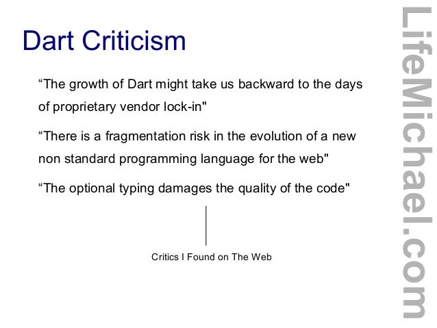 16. 16. “The growth of Dart might take us backward to the days of proprietary vendor lock-in" “There is a fragmentation risk in the evolution of a new non standard programming language for the web" “The optional typing damages the quality of the code" Critics I Found on The Web LifeMichael.com Dart Criticism