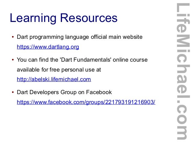 17. 17. ● Dart programming language official main website https://www.dartlang.org ● You can find the 'Dart Fundamentals' online course available for free personal use at http://abelski.lifemichael.com ● Dart Developers Group on Facebook https://www.facebook.com/groups/221793191216903/ LifeMichael.com Learning Resources