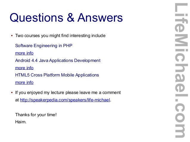 18. 18. ● Two courses you might find interesting include Software Engineering in PHP more info Android 4.4 Java Applications Development more info HTML5 Cross Platform Mobile Applications more info ● If you enjoyed my lecture please leave me a comment at http://speakerpedia.com/speakers/life-michael. Thanks for your time! Haim. LifeMichael.com Questions & Answers