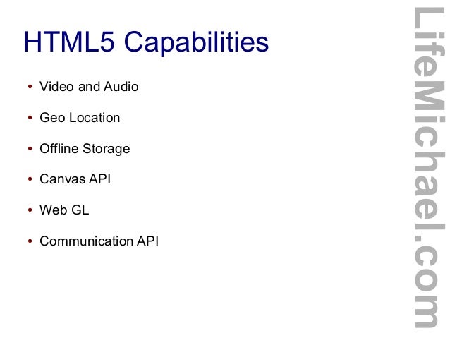 4. 4. ● Video and Audio ● Geo Location ● Offline Storage ● Canvas API ● Web GL ● Communication API LifeMichael.com HTML5 Capabilities