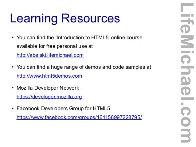 6. 6. ● You can find the 'Introduction to HTML5' online course available for free personal use at http://abelski.lifemichael.com ● You can find a huge range of demos and code samples at http://www.html5demos.com ● Mozilla Developer Network https://developer.mozilla.org ● Facebook Developers Group for HTML5 https://www.facebook.com/groups/161158997228795/ LifeMichael.com Learning Resources