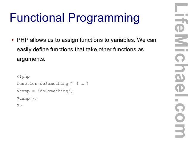 10. 10. ● PHP allows us to assign functions to variables. We can easily define functions that take other functions as arguments. <?php function doSomething() { … } $temp = 'doSomething'; $temp(); ?> LifeMichael.com Functional Programming