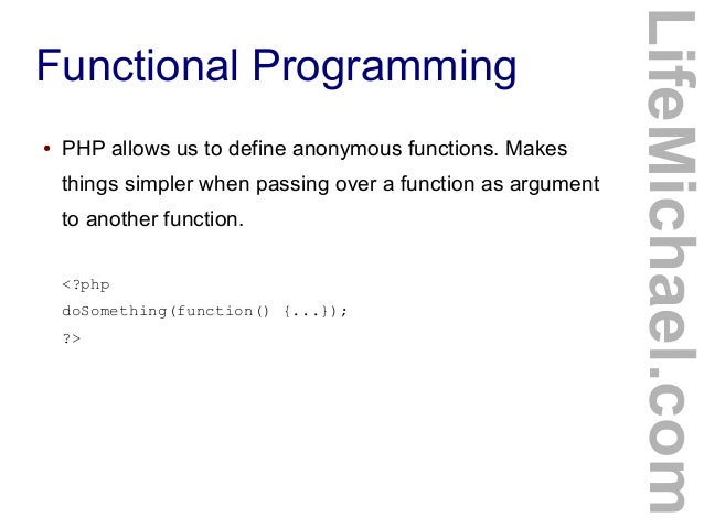 11. 11. ● PHP allows us to define anonymous functions. Makes things simpler when passing over a function as argument to another function. <?php doSomething(function() {...}); ?> LifeMichael.com Functional Programming