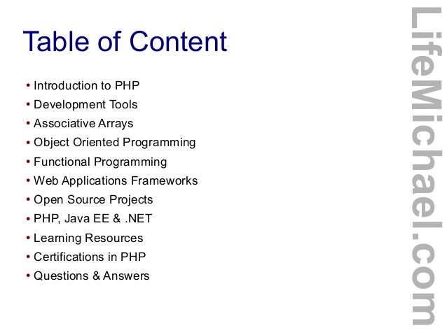 2. 2. ● Introduction to PHP ● Development Tools ● Associative Arrays ● Object Oriented Programming ● Functional Programming ● Web Applications Frameworks ● Open Source Projects ● PHP, Java EE & .NET ● Learning Resources ● Certifications in PHP ● Questions & Answers LifeMichael.com Table of Content