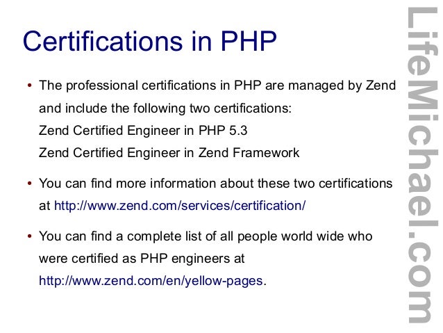 27. 27. ● The professional certifications in PHP are managed by Zend and include the following two certifications: Zend Certified Engineer in PHP 5.3 Zend Certified Engineer in Zend Framework ● You can find more information about these two certifications at http://www.zend.com/services/certification/ ● You can find a complete list of all people world wide who were certified as PHP engineers at http://www.zend.com/en/yellow-pages. LifeMichael.com Certifications in PHP