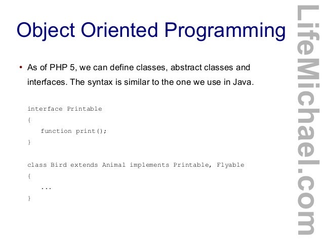 8. 8. ● As of PHP 5, we can define classes, abstract classes and interfaces. The syntax is similar to the one we use in Java. interface Printable { function print(); } class Bird extends Animal implements Printable, Flyable { ... } LifeMichael.com Object Oriented Programming
