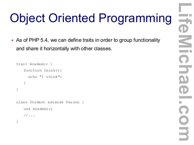 9. 9. ● As of PHP 5.4, we can define traits in order to group functionality and share it horizontally with other classes. trait Academic { function think(){ echo "I think"; } } class Student extends Person { use Academic; //... } LifeMichael.com Object Oriented Programming