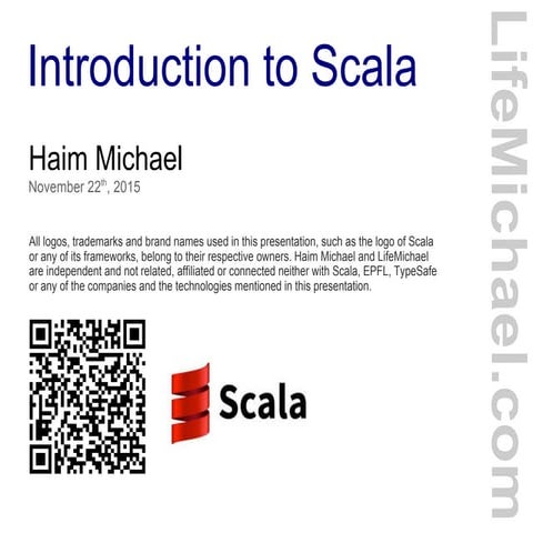 1. 1. Scala Jump Start Haim Michael May 30th , 2014 All logos, trademarks and brand names used in this presentation, such as the logo of Scala or any of its frameworks, belong to their respective owners. Haim Michael and LifeMichael are independent and not related, affiliated or connected neither with Scala, EPFL, TypeSafe or any of the companies and the technologies mentioned in this presentation. You can find the video clip at http://youtu.be/XBMbRZs7uFE. LifeMichael.com