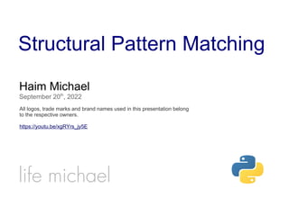 1. 1. Structural Pattern Matching Haim Michael September 20th , 2022 All logos, trade marks and brand names used in this presentation belong to the respective owners. https://youtu.be/xgRYrs_jy5E life michael