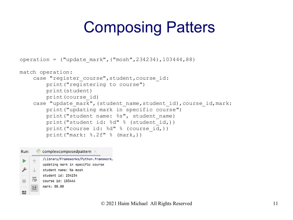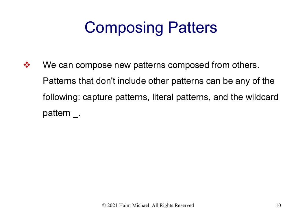 10. 10. © 2021 Haim Michael All Rights Reserved 10 Composing Patters  We can compose new patterns composed from others. Patterns that don't include other patterns can be any of the following: capture patterns, literal patterns, and the wildcard pattern _.