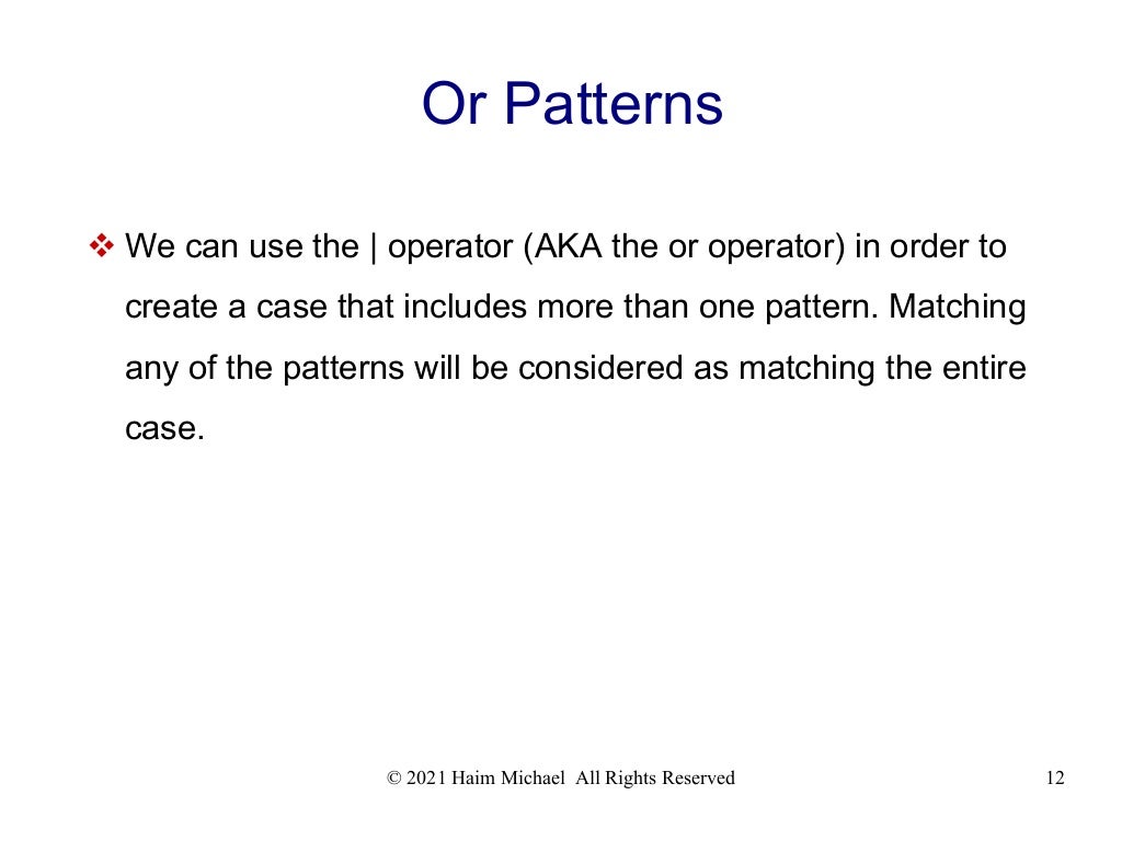 12. 12. © 2021 Haim Michael All Rights Reserved 12 Or Patterns  We can use the | operator (AKA the or operator) in order to create a case that includes more than one pattern. Matching any of the patterns will be considered as matching the entire case.