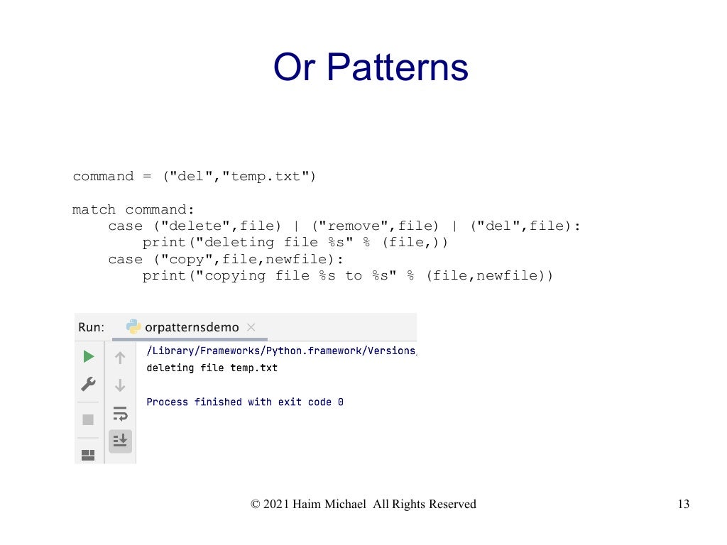 13. 13. © 2021 Haim Michael All Rights Reserved 13 Or Patterns command = ("del","temp.txt") match command: case ("delete",file) | ("remove",file) | ("del",file): print("deleting file %s" % (file,)) case ("copy",file,newfile): print("copying file %s to %s" % (file,newfile))