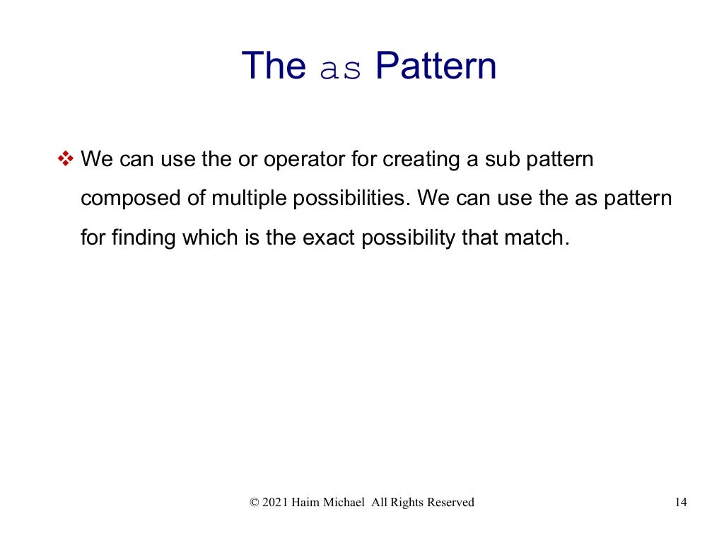 14. 14. © 2021 Haim Michael All Rights Reserved 14 The as Pattern  We can use the or operator for creating a sub pattern composed of multiple possibilities. We can use the as pattern for finding which is the exact possibility that match.