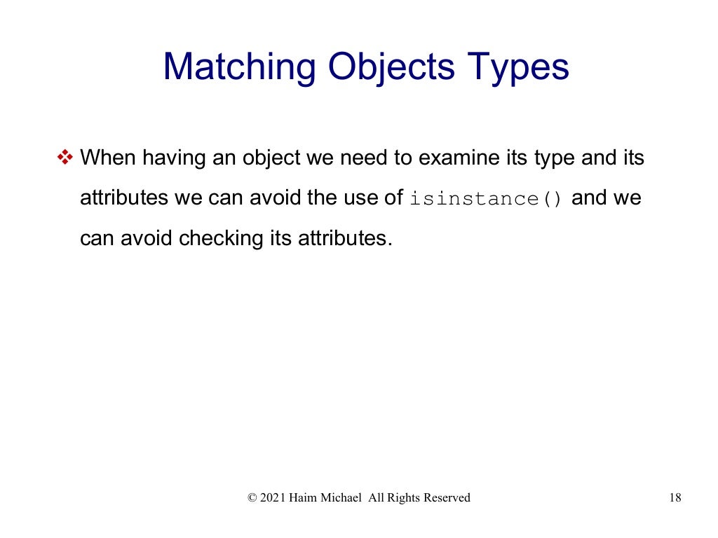 18. 18. © 2021 Haim Michael All Rights Reserved 18 Matching Objects Types  When having an object we need to examine its type and its attributes we can avoid the use of isinstance() and we can avoid checking its attributes.