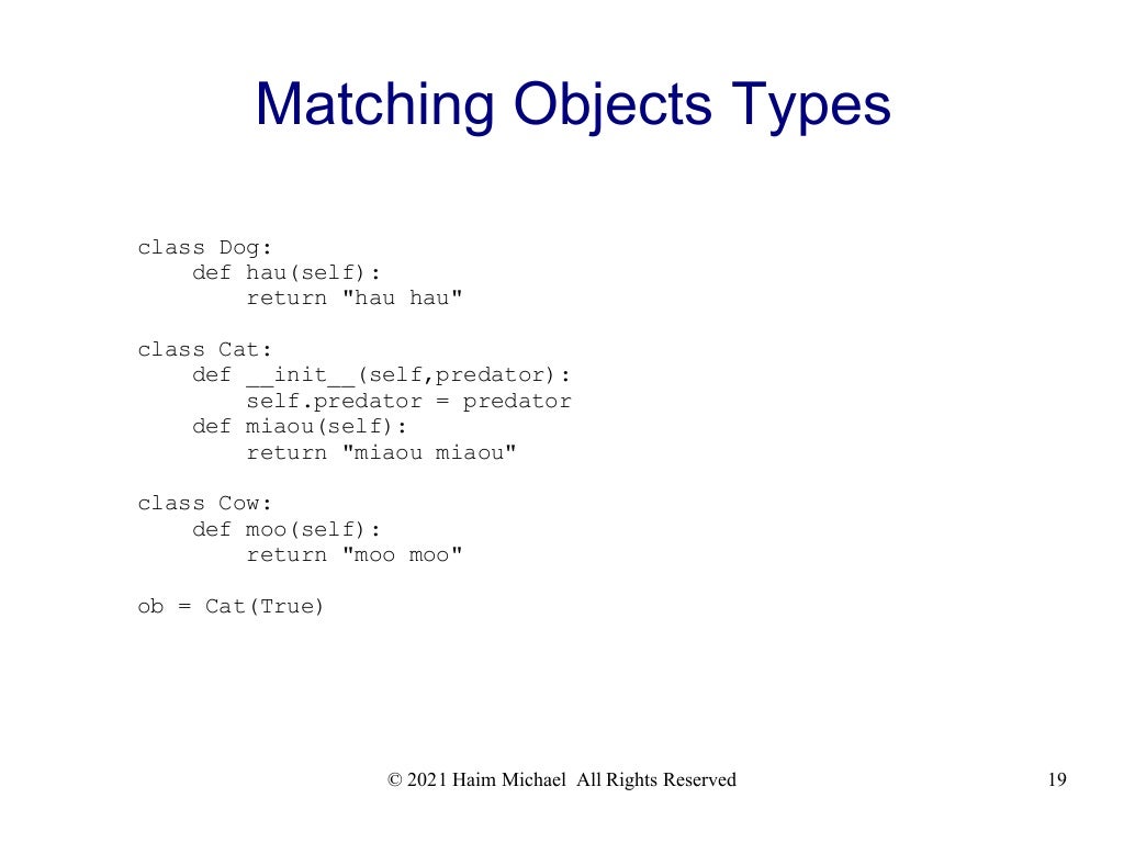 19. 19. © 2021 Haim Michael All Rights Reserved 19 Matching Objects Types class Dog: def hau(self): return "hau hau" class Cat: def __init__(self,predator): self.predator = predator def miaou(self): return "miaou miaou" class Cow: def moo(self): return "moo moo" ob = Cat(True)