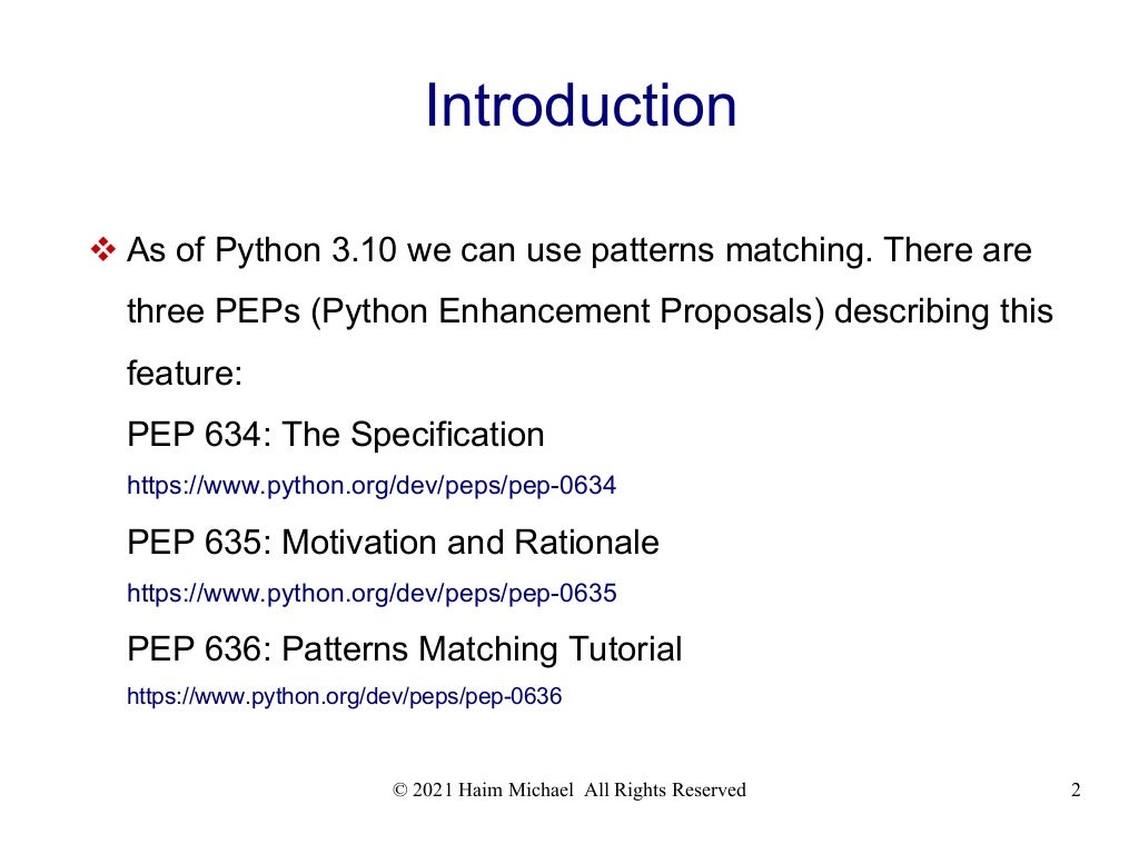 2. 2. © 2021 Haim Michael All Rights Reserved 2 Introduction  As of Python 3.10 we can use patterns matching. There are three PEPs (Python Enhancement Proposals) describing this feature: PEP 634: The Specification https://www.python.org/dev/peps/pep-0634 PEP 635: Motivation and Rationale https://www.python.org/dev/peps/pep-0635 PEP 636: Patterns Matching Tutorial https://www.python.org/dev/peps/pep-0636