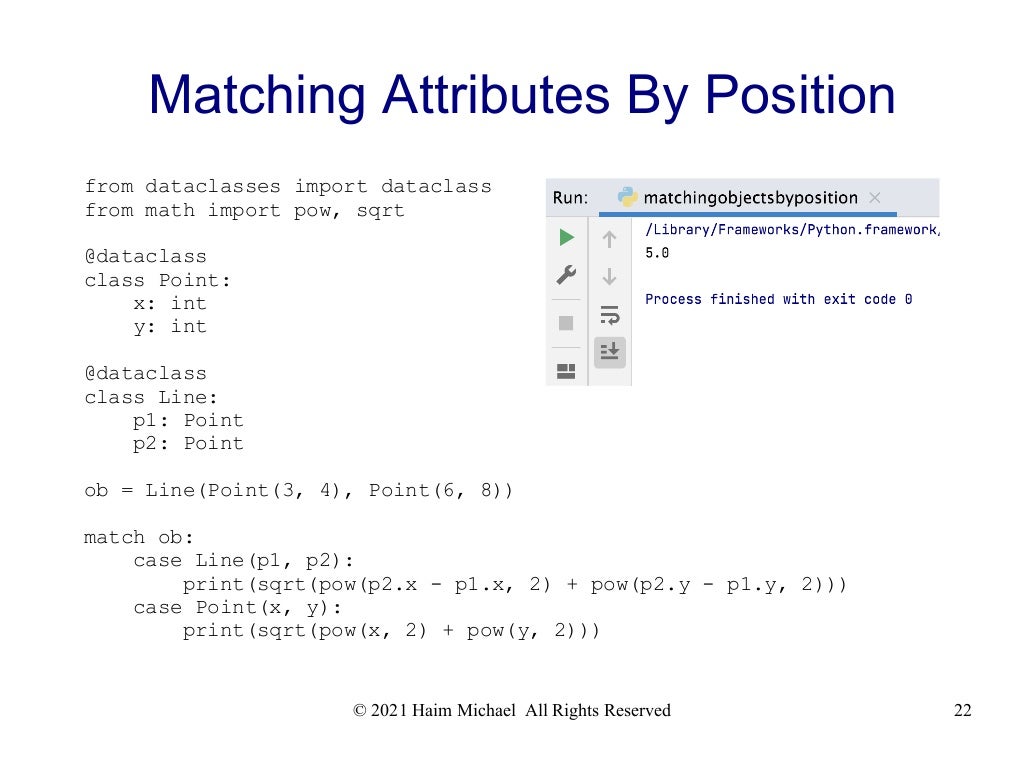 21. 21. © 2021 Haim Michael All Rights Reserved 21 Matching Attributes By Position  When using objects that were instantiated from a class marked as dataclass we can describe the matched attributes by position.