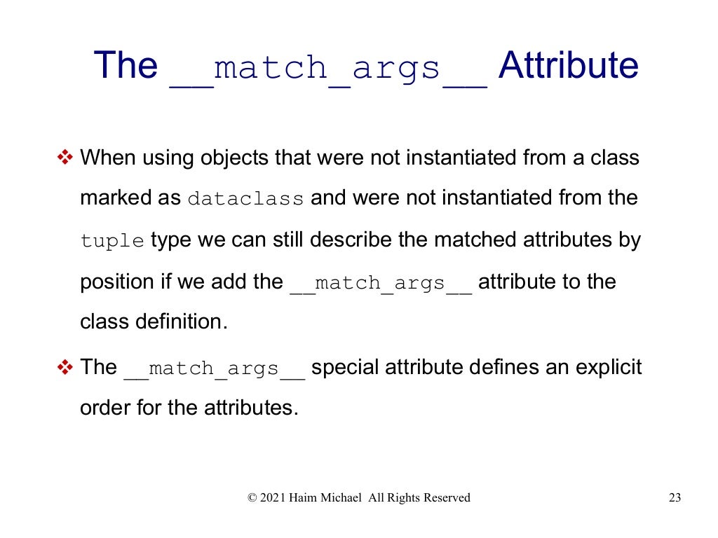 23. 23. © 2021 Haim Michael All Rights Reserved 23 The __match_args__ Attribute  When using objects that were not instantiated from a class marked as dataclass and were not instantiated from the tuple type we can still describe the matched attributes by position if we add the __match_args__ attribute to the class definition.  The __match_args__ special attribute defines an explicit order for the attributes.