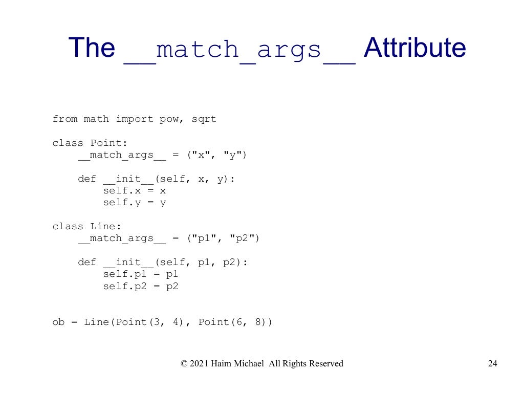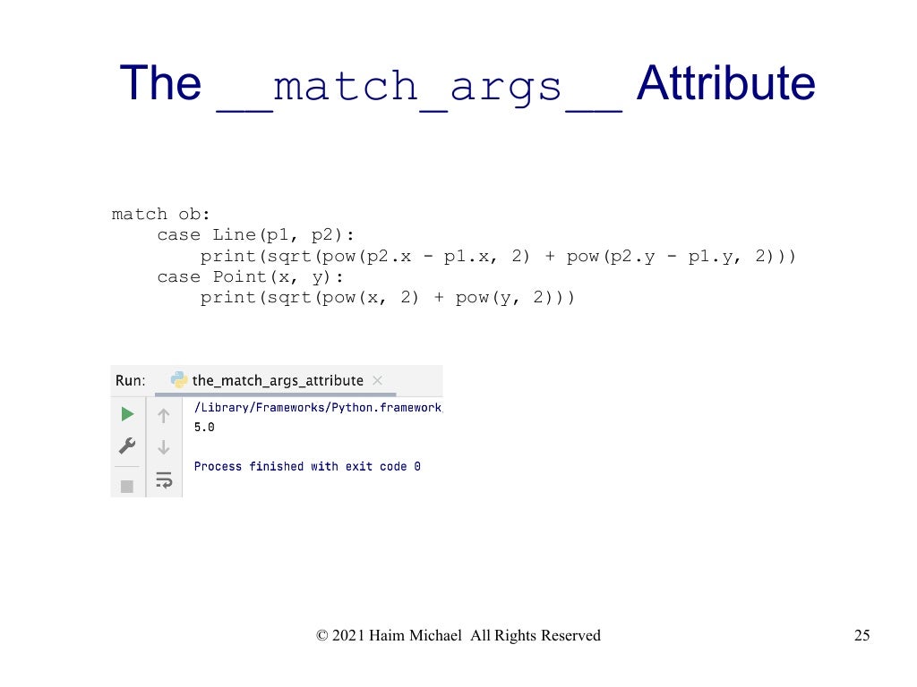 25. 25. © 2021 Haim Michael All Rights Reserved 25 The __match_args__ Attribute match ob: case Line(p1, p2): print(sqrt(pow(p2.x - p1.x, 2) + pow(p2.y - p1.y, 2))) case Point(x, y): print(sqrt(pow(x, 2) + pow(y, 2)))
