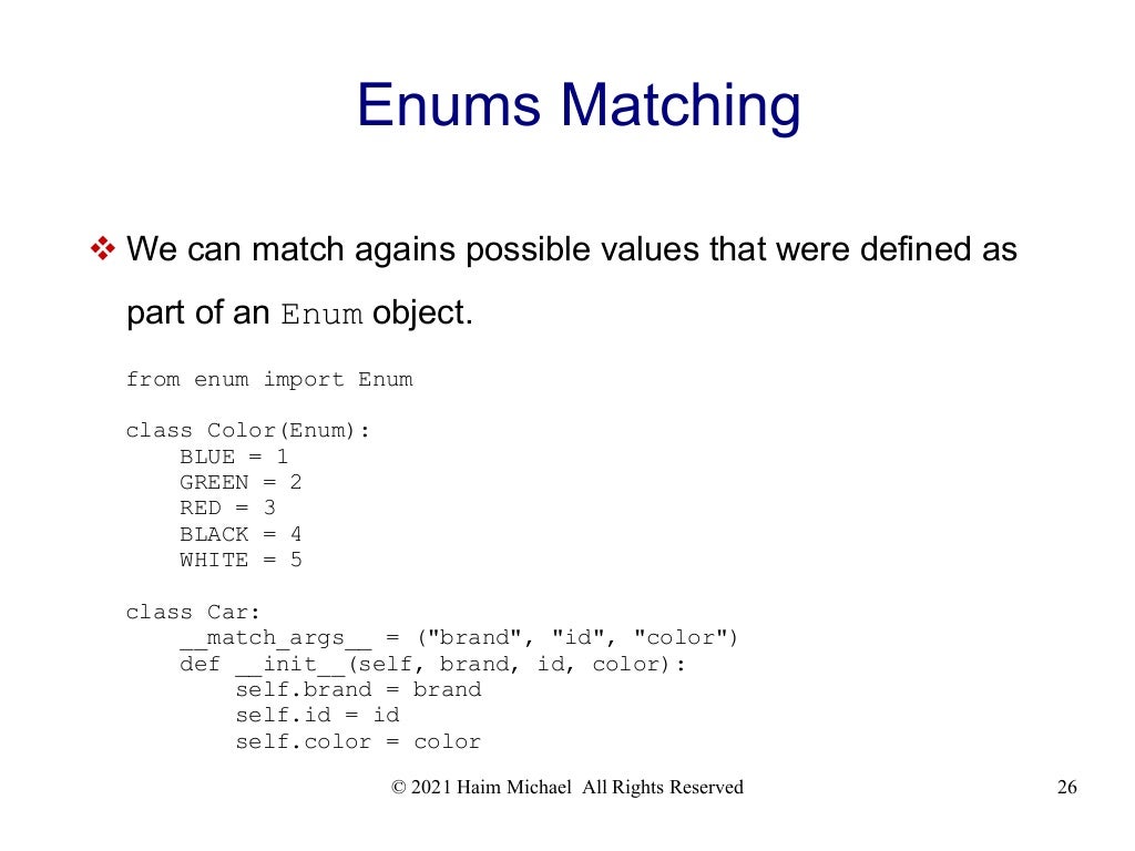 26. 26. © 2021 Haim Michael All Rights Reserved 26 Enums Matching  We can match agains possible values that were defined as part of an Enum object. from enum import Enum class Color(Enum): BLUE = 1 GREEN = 2 RED = 3 BLACK = 4 WHITE = 5 class Car: __match_args__ = ("brand", "id", "color") def __init__(self, brand, id, color): self.brand = brand self.id = id self.color = color