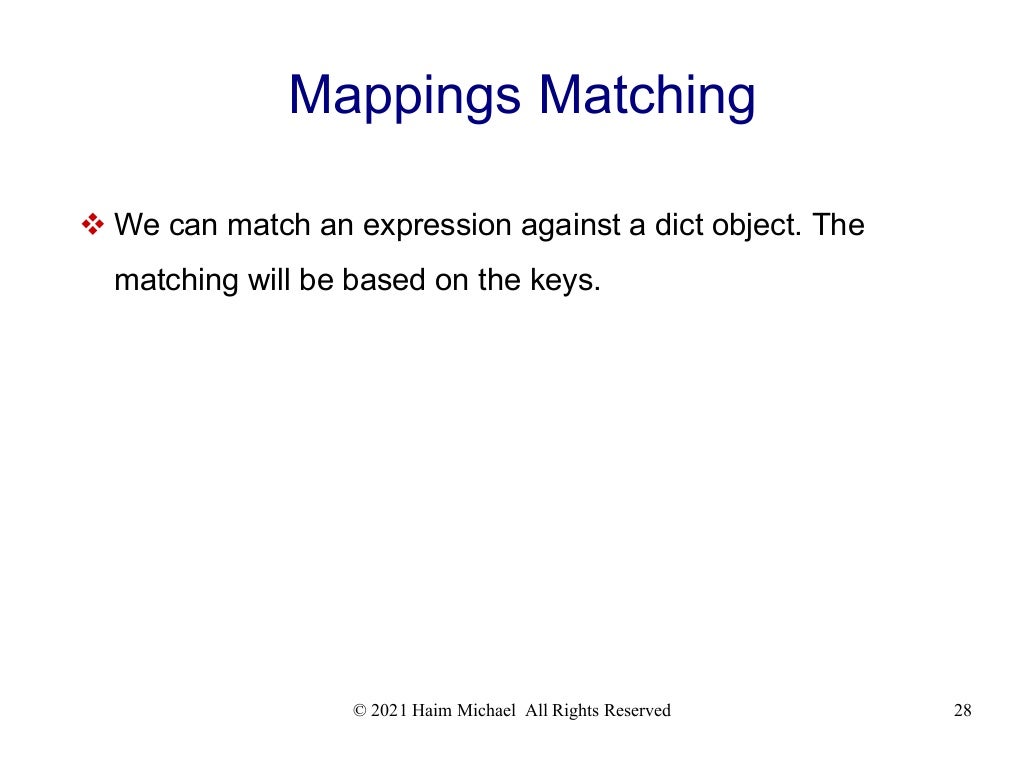 28. 28. © 2021 Haim Michael All Rights Reserved 28 Mappings Matching  We can match an expression against a dict object. The matching will be based on the keys.