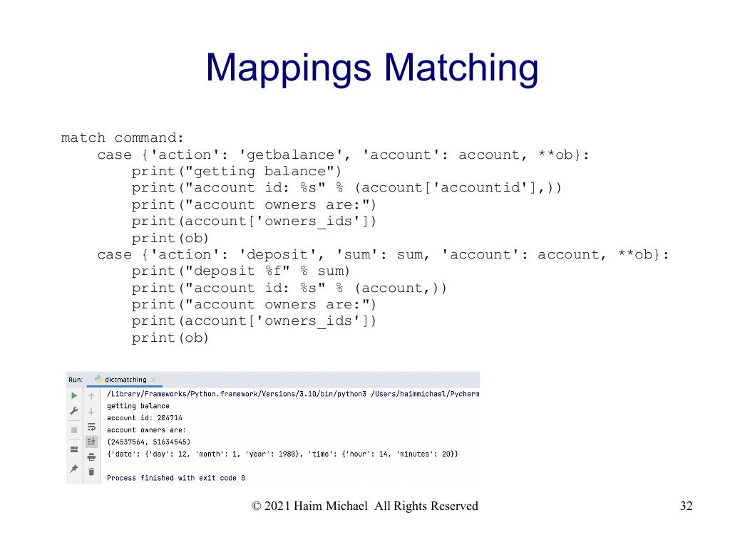 31. 31. © 2021 Haim Michael All Rights Reserved 31 Mappings Matching  We can use the dict packing capability when matching a dict object with additional key value pairs that don't match any of the pattern's parts. command = { 'action': 'getbalance', 'account': { 'accountid': 204714, 'owners_ids': (24537564, 51634545) }, 'date': {'day':12,'month':1,'year':1980}, 'time': {'hour': 14, 'minutes': 20} }