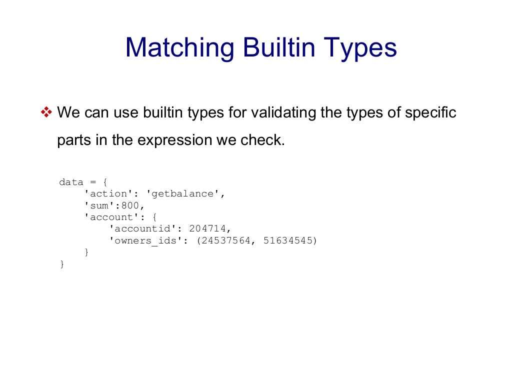 33. 33. Matching Builtin Types  We can use builtin types for validating the types of specific parts in the expression we check. data = { 'action': 'getbalance', 'sum':800, 'account': { 'accountid': 204714, 'owners_ids': (24537564, 51634545) } }