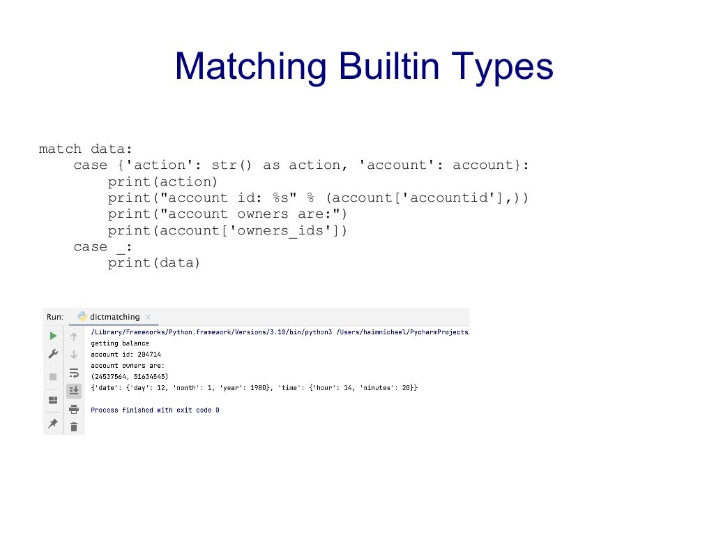 34. 34. Matching Builtin Types match data: case {'action': str() as action, 'account': account}: print(action) print("account id: %s" % (account['accountid'],)) print("account owners are:") print(account['owners_ids']) case _: print(data)