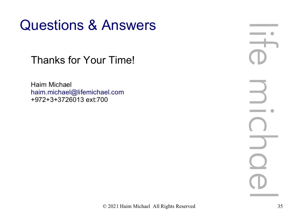 35. 35. © 2021 Haim Michael All Rights Reserved 35 Questions & Answers Thanks for Your Time! Haim Michael haim.michael@lifemichael.com +972+3+3726013 ext:700 life michael