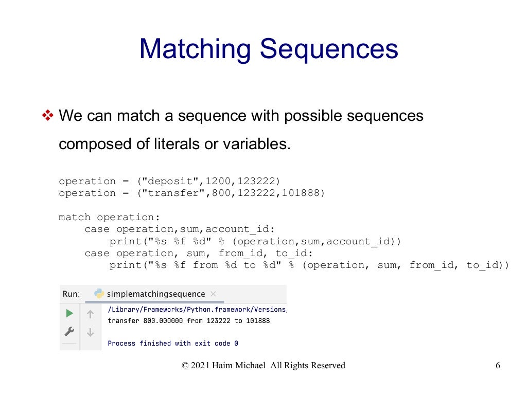 6. 6. © 2021 Haim Michael All Rights Reserved 6 Matching Sequences  We can match a sequence with possible sequences composed of literals or variables. operation = ("deposit",1200,123222) operation = ("transfer",800,123222,101888) match operation: case operation,sum,account_id: print("%s %f %d" % (operation,sum,account_id)) case operation, sum, from_id, to_id: print("%s %f from %d to %d" % (operation, sum, from_id, to_id))