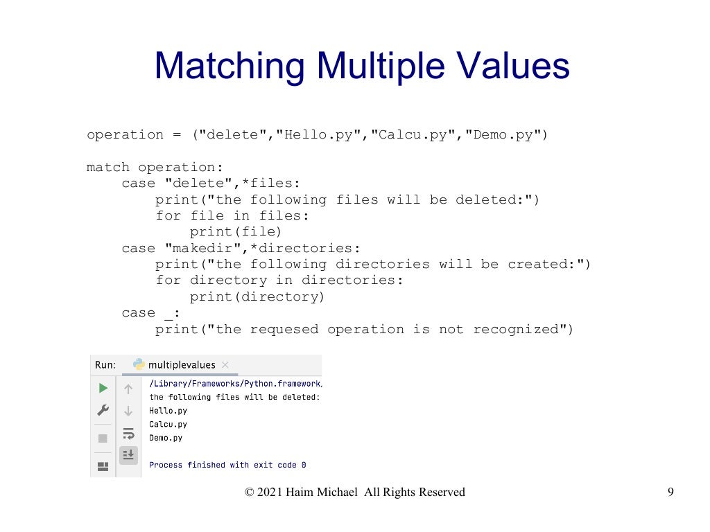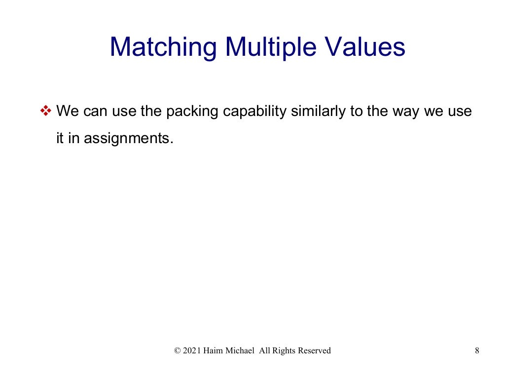 8. 8. © 2021 Haim Michael All Rights Reserved 8 Matching Multiple Values  We can use the packing capability similarly to the way we use it in assignments.