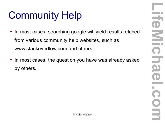 11. 11. ● In most cases, searching google will yield results fetched from various community help websites, such as www.stackoverflow.com and others. ● In most cases, the question you have was already asked by others. © Haim Michael LifeMichael.com Community Help