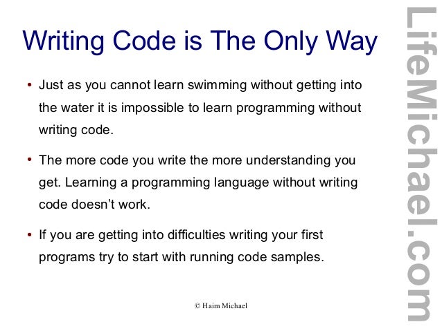 5. 5. ● Just as you cannot learn swimming without getting into the water it is impossible to learn programming without writing code. ● The more code you write the more understanding you get. Learning a programming language without writing code doesn’t work. ● If you are getting into difficulties writing your first programs try to start with running code samples. © Haim Michael LifeMichael.com Writing Code is The Only Way