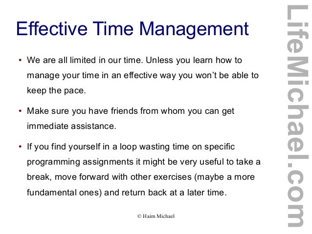 7. 7. ● We are all limited in our time. Unless you learn how to manage your time in an effective way you won’t be able to keep the pace. ● Make sure you have friends from whom you can get immediate assistance. ● If you find yourself in a loop wasting time on specific programming assignments it might be very useful to take a break, move forward with other exercises (maybe a more fundamental ones) and return back at a later time. © Haim Michael LifeMichael.com Effective Time Management