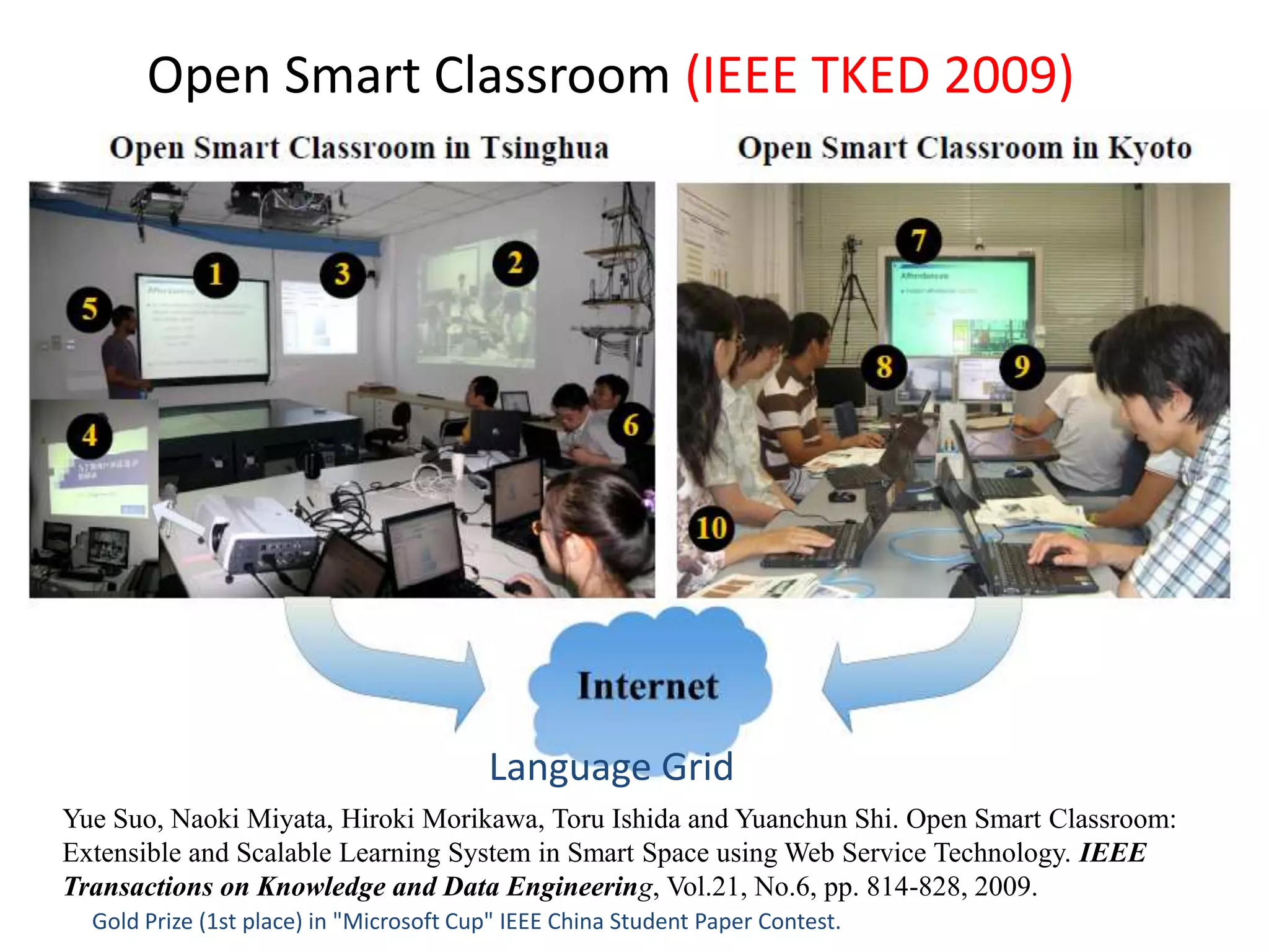 38. 38. Open Smart Classroom (IEEE TKED 2009)<br />Language Grid<br />YueSuo, Naoki Miyata, Hiroki Morikawa, Toru Ishida and Yuanchun Shi. Open Smart Classroom: Extensible and Scalable Learning System in Smart Space using Web Service Technology. IEEE Transactions on Knowledge and Data Engineering, Vol.21, No.6, pp. 814-828, 2009.<br />Gold Prize (1st place) in "Microsoft Cup" IEEE China Student Paper Contest.<br />