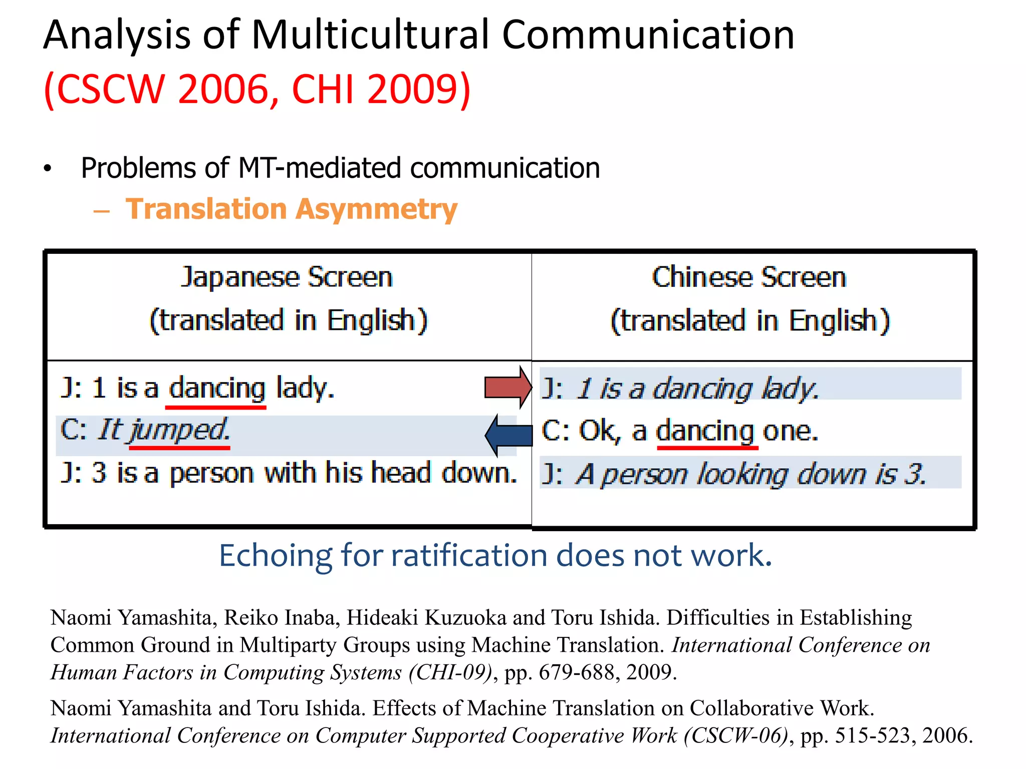 39. 39. Analysis of Multicultural Communication<br />(CSCW 2006, CHI 2009)<br />Problems of MT-mediated communication<br />Translation Asymmetry<br />Echoing for ratification does not work.<br />Naomi Yamashita, Reiko Inaba, Hideaki Kuzuoka and Toru Ishida. Difficulties in Establishing Common Ground in Multiparty Groups using Machine Translation. International Conference on Human Factors in Computing Systems (CHI-09), pp. 679-688, 2009.<br />Naomi Yamashita and Toru Ishida. Effects of Machine Translation on Collaborative Work. International Conference on Computer Supported Cooperative Work (CSCW-06), pp. 515-523, 2006.<br />