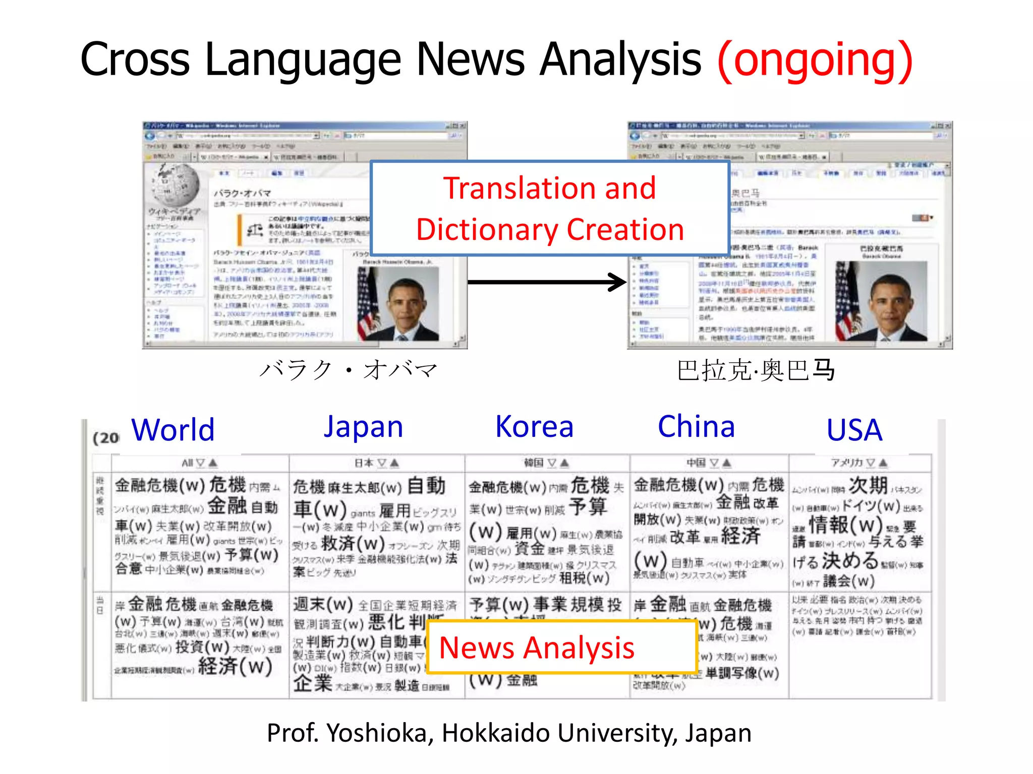 40. 40. Cross Language News Analysis (ongoing)<br />Translation andDictionary Creation<br />バラク・オバマ<br />巴拉克·奥巴马<br />Japan<br />China<br />Korea<br />USA<br />World<br />News Analysis<br />Prof. Yoshioka, Hokkaido University, Japan<br />